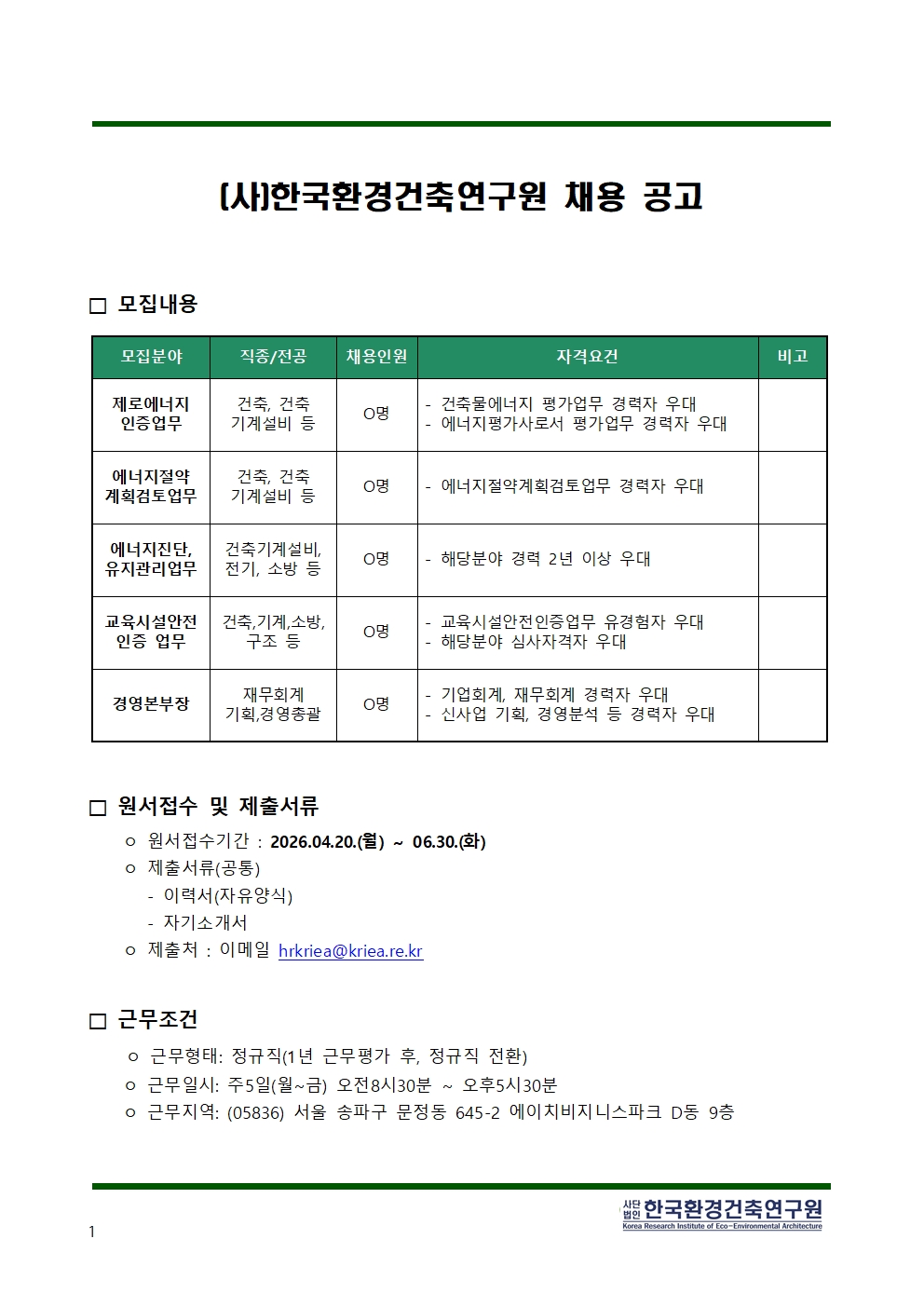 | 제목 | [채용] 한국환경건축연구원 분야별 채용공고 | ||
